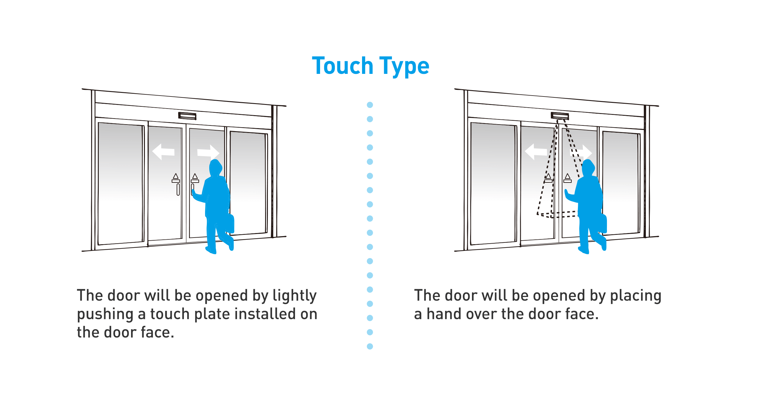 | (3) Sensor aktivasi | Sensor aktivasi digunakan untuk mengaktifkan bukaan dan penutupan pintu dengan mengirimkan sinyal ke operator pintu. [Catatan] Gambar di atas menunjukkan berbagai jenis sensor aktivasi. Sensor aktivasi yang tepat harus dipilih berdasarkan penggunaan dan lingkungan. |
