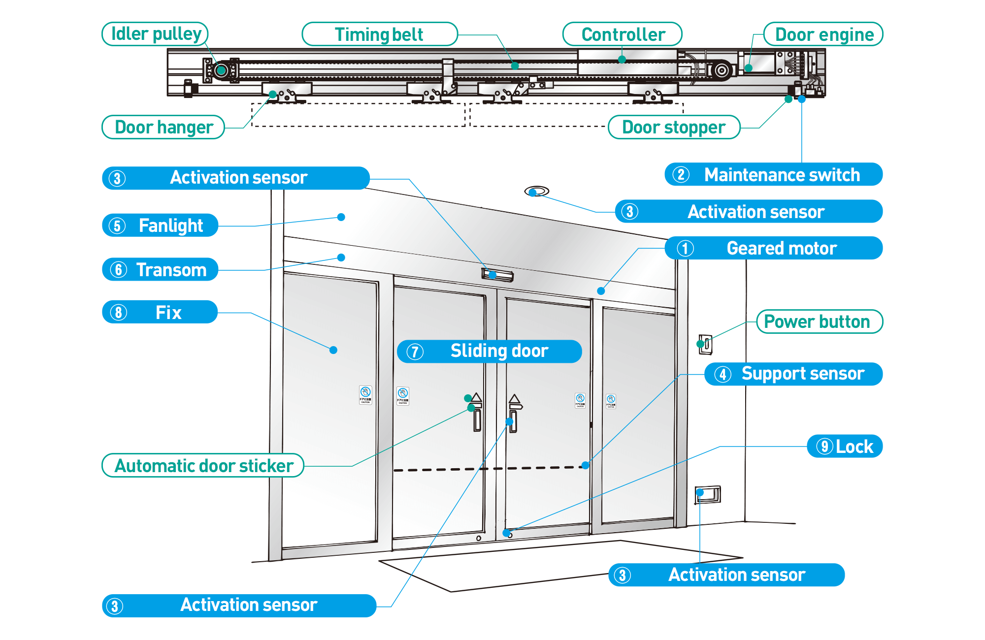 | (1) Operator pintu | Operator pintu otomatis adalah seperangkat perangkat penggerak dan pengontrol yang membuka/menutup pintu. Komponen-komponennya meliputi motor roda gigi dan pengontrol pintu. |