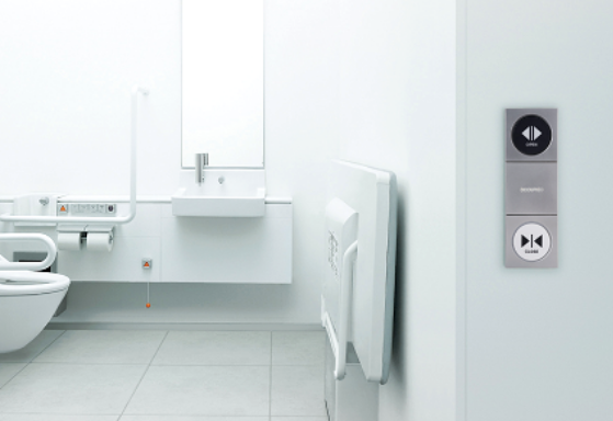 Semakin banyak toilet tanpa penghalang yang diharuskan dilengkapi dengan pintu otomatis agar lebih mudah dibuka dan ditutup. NABCO menawarkan berbagai macam sakelar untuk toilet tanpa penghalang.